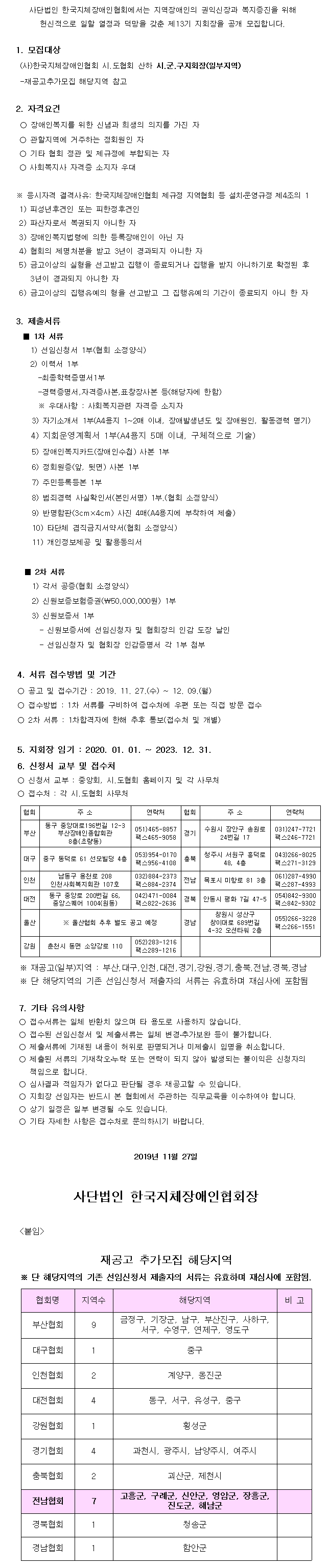 제13기 시.군.구 지회장 정기모집 재(추가)공고문(일부지역) 전남지장협 0 5872 2019.11.28 09:13 2025.06.25 03:29 제13기 지회장 정기모집 재(추가)공고문.hwp.zip (8.9K) + 0 2025.06.25 03:29 지회장 신청서양식.hwp.zip (11.6K) + 0