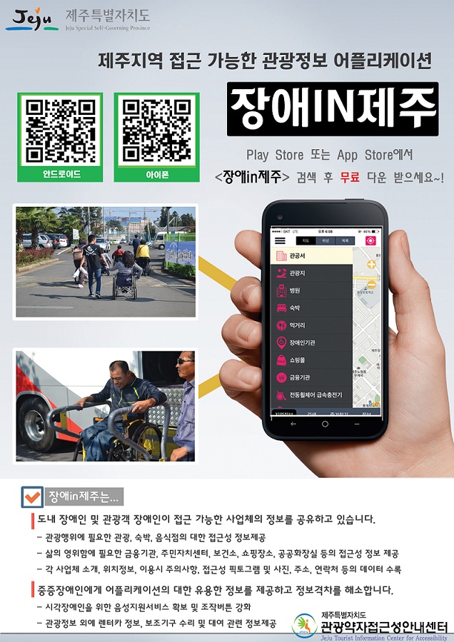 접근 가능한 제주관광 어플리케이션을 소개합니다. 제주관광약자접근성안내센터 0 5165 2017.07.04 16:39 저희 관광약자 접근성 안내센터에서는 장애인 등의 관광약자의 접근 가능한 관광의 실현을 위해 권익옹호 및 제주관광환경 인프라 개선 등의 사업을 추진하고 있습니다. 위 사업의 일환으로 접근 가능한 제주관광정보를 모은 어플리케이션 “장애in제주”를 개발•운영하고 있으니 많은 활용 부탁드립니다.