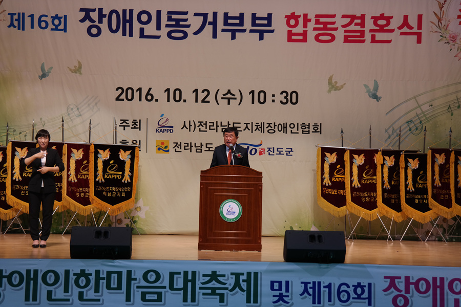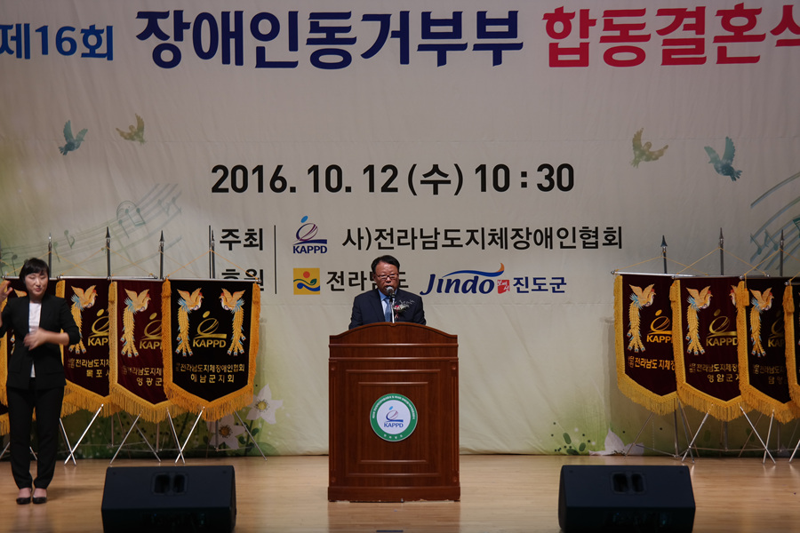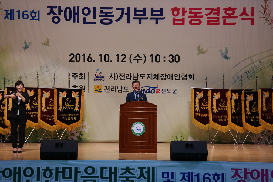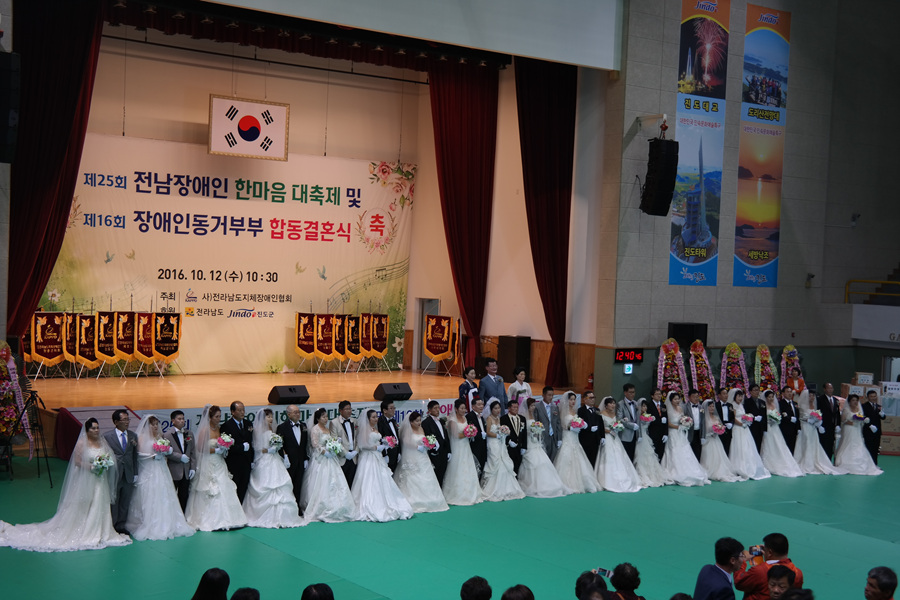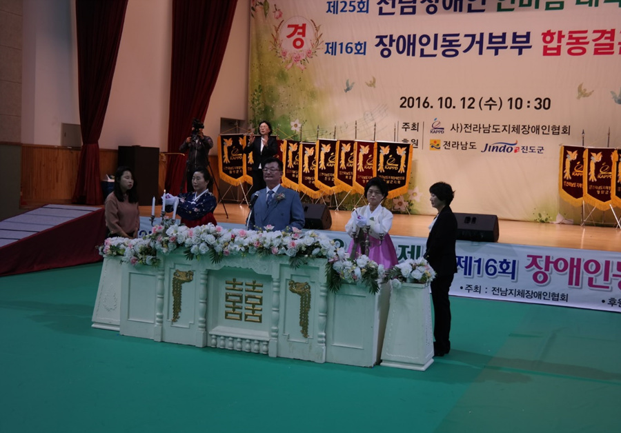 <div style="text-align: justify;"><span style="font-size: 9pt;">2016년 10월 12일 오전 11시 부터 진도 실내 체육관에서 제 25회 한마음 대축제 및 제 16회 장애인 동거</span></div><div>부<span style="font-size: 9pt;">부 </span><span style="font-size: 9pt;">합동결혼식이 열렸습니다.</span><div><span style="font-size: 9pt;"><br></span></div><div>이 자리에는 김갑섭 전라남도 행정부지사님, 최영애 여사님(윤영일 국회의원 대리참석), </div><div>이동진 진도군수, <span style="font-size: 9pt;">이건휘 한국지체장애인협회 부회장, 김인정 진도군의회의장, 강성희 진도경찰서장, </span></div><div><span style="font-size: 9pt;">장경희 장애인 고용공단</span><span style="font-size: 9pt;">전남지사장, 김덕윤 직업능력개발원장, 등 많은 분들이 함께 자리를 빛내 주셨으며, 기념식 후에는 여러가지 이유로 인하여 식을 올리지 못한채 많은 시간들을 함께 해온 장애인 동거부부에 합동결혼식을 개최 하였습니다.</span></div><div><span style="font-size: 9pt;"><br></span></div><div><span style="font-size: 9pt;">본식 이후에는 전남 거주 장애인의 축제 한마당이 펼쳐져 레크레이션과 가요제를 진행하였으며, 2016년 10월 12(수)~14(금)까지 결혼식을 올린 장애인 동거부부와 제주도로 2박 3일 신혼여행을 다녀 왔습니다.</span></div><div><span style="font-size: 9pt;"><br></span></div><div><br></div><div><p class="0"><br></p><p class="0"><br></p></div></div>