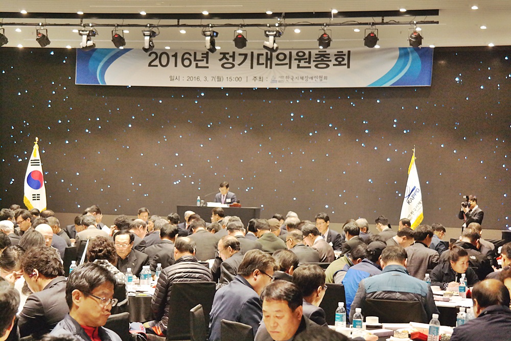 <P align=left>2016년 3월 7일(월) 오후 3시 부터 서울 여의도 글래드호텔에서 2016년 정기 대의원 총회 및 장애인 정치세력화 전진대회가 있었습니다.<BR><BR>전남협회는 28명의 대의원이 본 행사에 참여 하였으며, 정기총회에서는 2015년도 사업보고 및 결산(안)과 2016년 사업계획 및 예산(안)이 안건으로 상정되어 심의 하였으며, 총회 후에는 장애인 정치 세력화 전진대회가 있었습니다.<BR><BR>이 자리에서는 장애인의 인권과 권익을 스스로 지켜내기 위해서 장애인 스스로 정치 세력화하여 대표자를 국회에 보내자는 결의를 다지는 자리로 장애인의 국회 입성을 위한 노력을 "마중물"에 비유 하며 장애인의 정치 참여를 지지하는 찬조연설이 인상 깊었습니다.<BR><BR>한편 김광환 한국지체장애인협회장님은 새누리당 비례대표 신청을 통해, 국회 진출을 위한 첫발을 디뎠으며, 전남지체 장애인협회는 김광환 중앙회장님의 국회 진출을 간절한 마음으로 지지하고 있습니다. </P>