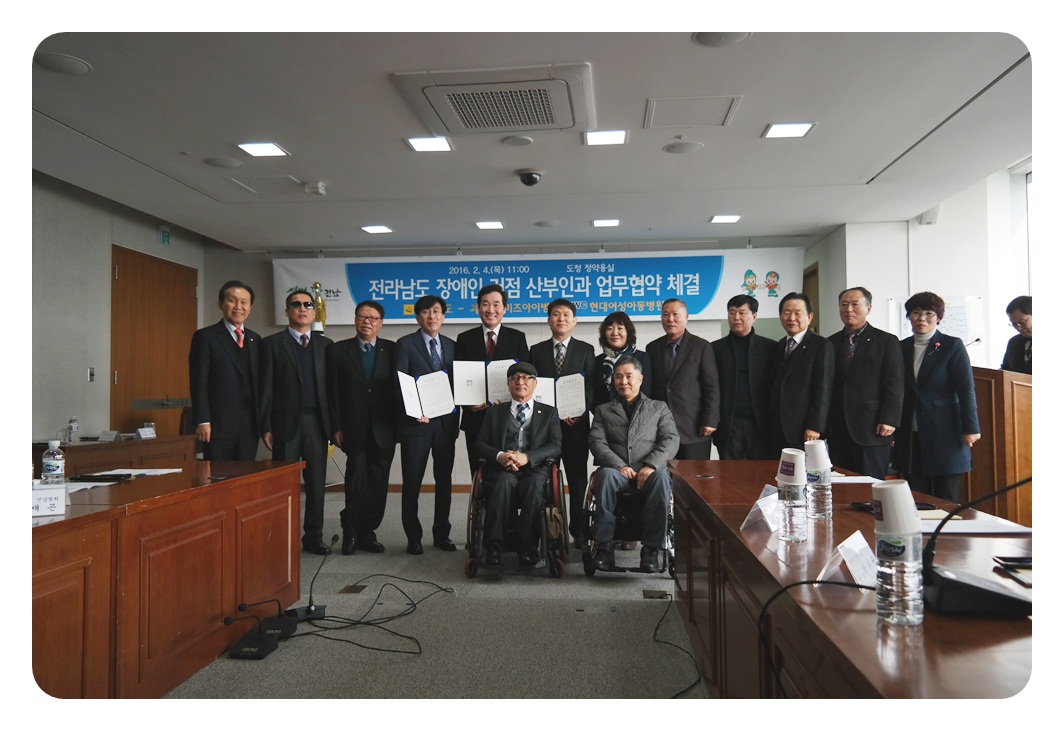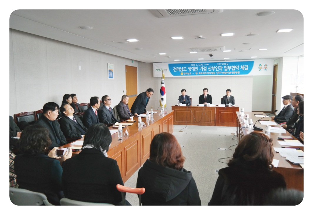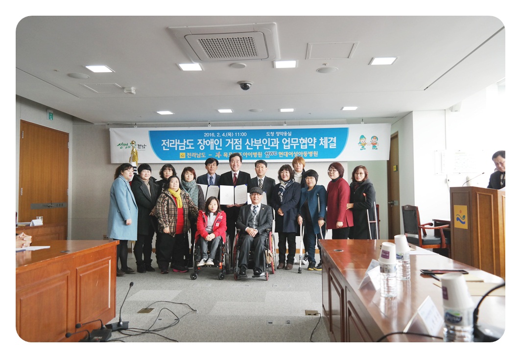 <P align=left>2016년 2월 4일 목요일 오전 11시 부터 전남도청 정약용 실에서 전라남도와 미즈아이병원, 전라남도와 현대 여성아동병원 간의 여성 장애인의 모성권보호와 출산친화 환경 조성을 위한 장애인 거점 산부인과 운영협약 체결식이 있었습니다.<BR>총 40여명이 참석한 이자리에는 전라남도지사 를 비롯하여 보건복지국장, 노인장애인과장, 목포 미즈아이병원장(강용필), 현대여성아동병원장(정기현), 기획사회위원회 박철홍 의원, 전라남도 지체장애인협회 장재곤회장을 비롯한 장애인단체 대표 8명, 전남여성자애인연대 12명이 참석하여 자리를 빛내주었습니다<BR>한편 이번 협약을 통하여 목포, 순천 2곳의 여성 장애인 전문 산부인과 2개소와의 협약을 통하여 도비 총 1억원의 예산을 통하여 장애인용 의료장비 및 편의시설설치가 진행될 예정입니다.<BR> <BR></P>