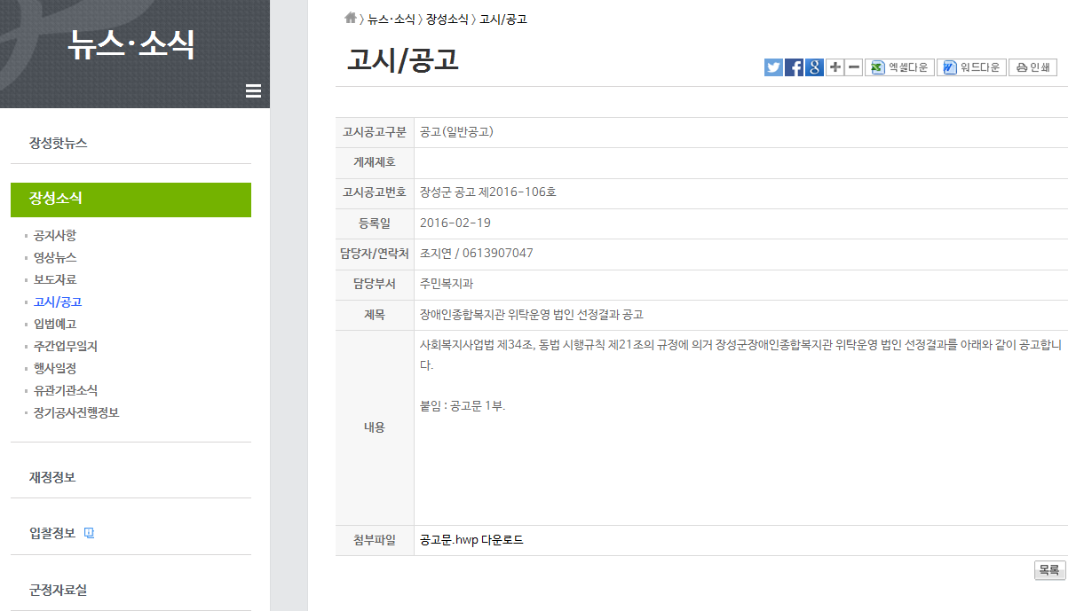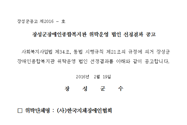 <P align=left>한국지체장애인협회는 장성군 장애인 복지관 위탁운영기관 선정 공고에 참여하여 2016. 2. 19(금) 14:00부터 진행된 위탁 기관 선정 발표에 참여하여 최종적으로 수탁 기관으로 선정되었습니다.<BR><BR>한편 장성군 노인복지관은 2016년 4월중 개관 예정이며, 총 49억의 경비로 지상 2층 규모 신축 되고 있으며 현재 약 90%의 공정률을 보이고 있습니다.<BR><BR>한국지체장애인협회는 향후 3년간 수탁 운영을 체결 하게 되며, 장성군 장애인을 위한 최고의 복지 센터로 거듭 나도록 최선의 노력을 다해 운영 하겠습니다.<BR><BR> </P>