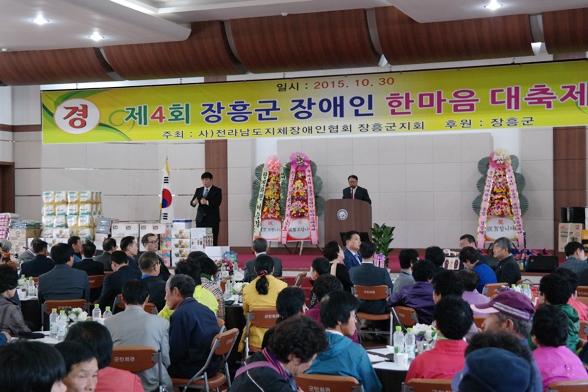 <P style="MARGIN-BOTTOM: 1.6pt" class=바탕글 align=left>2015년 10월 30일(금) 장흥 군민회관 3층에서 제 4회 장흥군 장애인 한마음 대축제가 성대하게 열렸다. </P>