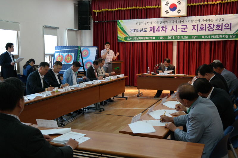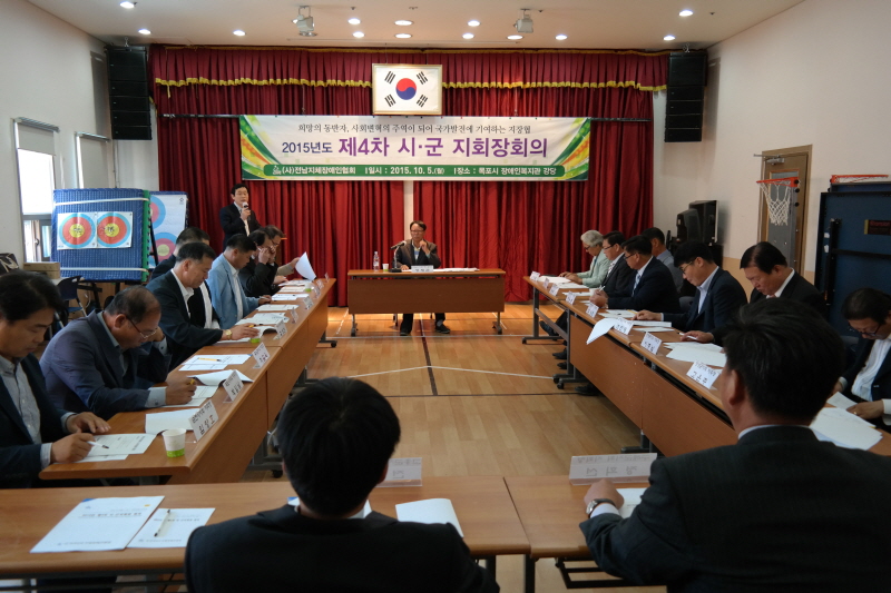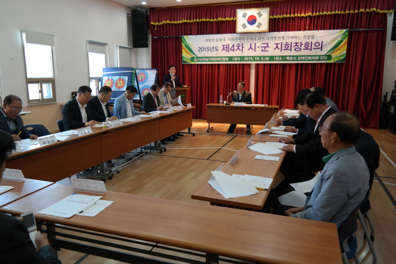<P style="MARGIN-BOTTOM: 1.6pt" class=바탕글><SPAN style="FONT-SIZE: 13pt" lang=EN-US>2015. 10. 05(목) 11:00~ 제4차 시․군지회장 회의를 가졌다.<BR></SPAN><SPAN style="FONT-SIZE: 13pt">이날 회의 안건으로는 제32회 전국장애인 기능경기대회 결과 보고, 제5차 운영이사회의 결과보고, 한마음축제 및 합동결혼식 관련 사항, 전국장애인체육대회 관련하여 약 1시간가량 회의를 하였고, 중앙회, 도협회, 시군지회 3/4분기 일정에 관련하여 이야기도 나누었다.</SPAN></P>