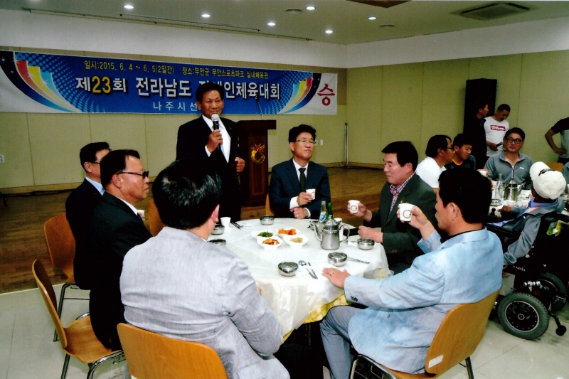 <SPAN id=writeContents>2015. 06. 04.(목) ~ 06. 05.(금) 1박2일 동안 무안군 스포츠파크에서 제23회 전라남도장애인체육대회가 열렸다. 이날 전남장애인체육대회 부회장으로 겸직하고 있는 장재곤 부회장님께서는 스포츠 정신과 선수단의 협력, 응원단의 활기 등을 강조하면서 전라남도를 대표하는 선수들과 응원단들이 되도록 격려하였다. 또한 전남지체장애인협회 장재곤 협회장님은 강인규 나주시장님과 더불어 강선수 나주시지회장님과 함께 나주시 지체장애인의 편의증진 및 인권보호, 시 차원에서의 협력 등 장애인들이 편히 쉬고 즐기며 일할 수 있는 나주시를 만들어가도록 협의하는 시간을 갖았다.</SPAN>