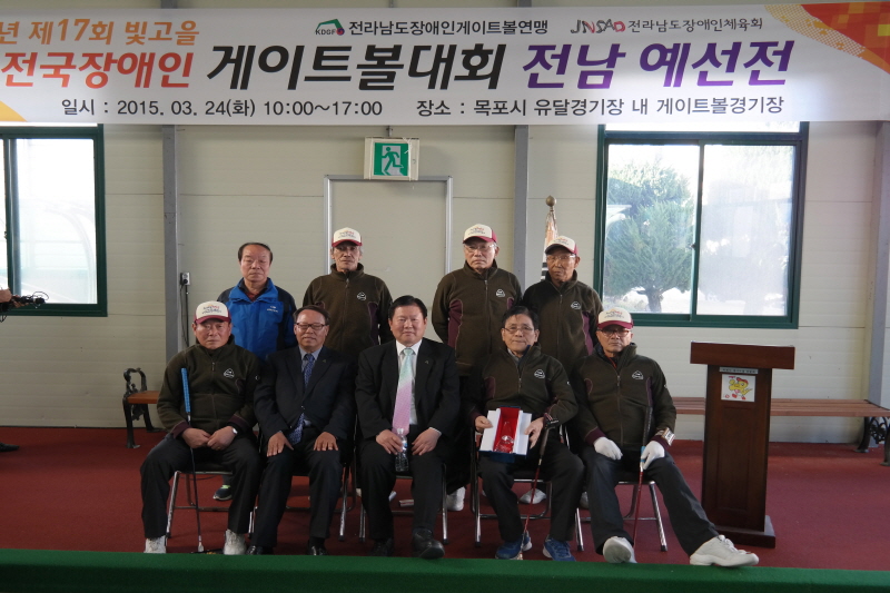 <P>2015. 3. 24.(화) 10:00~17:00 2015년 제17회 빛고을 전국장애인게이트볼대회 전남 예선전을 목포시 유달경기장에서 갖았다.<BR>이날 예선전에서는 전남도청 기획사회위원회 강성휘 위원장님을 비롯하여, 전남장애인게이트볼연맹 장흥군지부장, 화순군지부장, 영광군지부장, 해남군지부장, 목포시지부장님이 참석하였으며, 목포시게이트볼연맹 소속 박종길 외 7명의 심판이 수고를 해주시고, 총 9개팀 100여명의 선수와 임원들이 참석하였다.<BR>경기결과는 1위 영광군지부팀, 2위 여수동백팀, 3위 화순지부팀, 4위 목포유달팀이 수상하였다.</P>