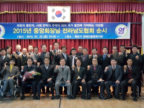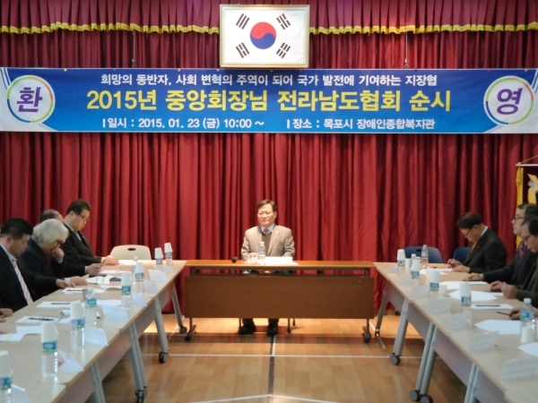(사)전남지체장애인협회에서는 2015. 1. 23(금) 목포시장애인종합복지관 2층 강당에서 "2015 중앙회장님 전라남도협회 순시"를 갖았다. 김광환 중앙회장님께서는 지장협 소속 직원들의 교육에 중점을 두어 사회 변혁의 주역이 되기를 바랬다. 이날 순시에서는 전남도청 강성휘 기획사회위원회 위원장, 박철홍 의원님, 함창환 장애인복지계장, 조문호 목포장애인종합복지관장, 정호연 한국장애인고용공단 전남지사장, 전남 지체장애인협회 산하 20개 시군지회장 및 보호작업장 원장 등이 참석하였다.