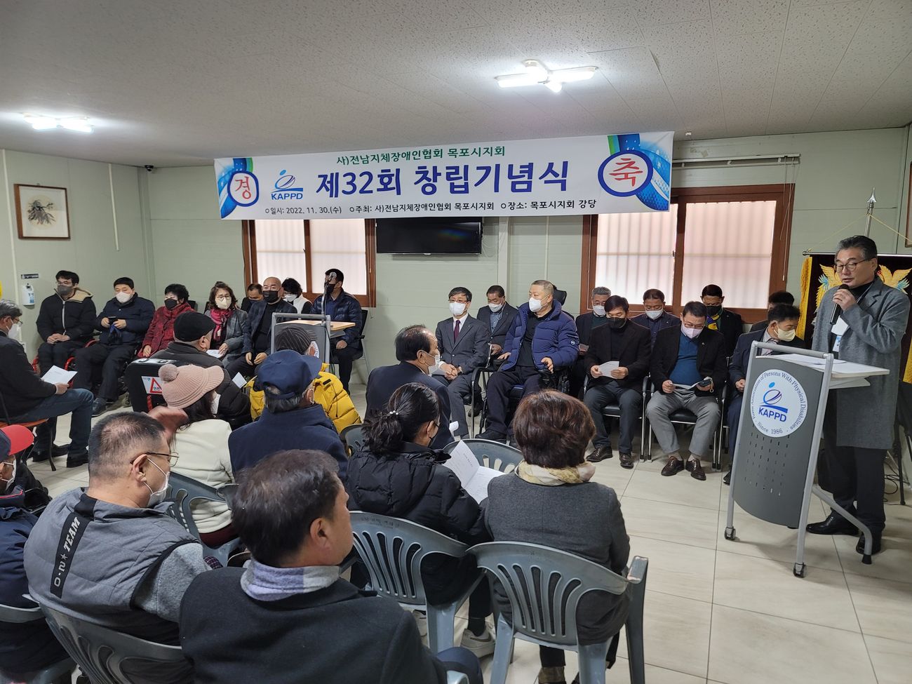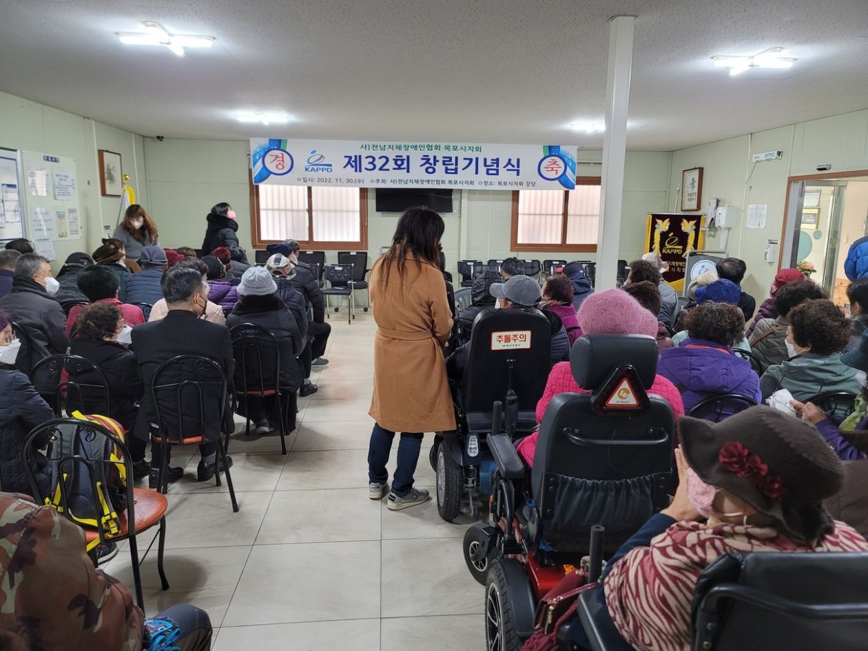 목포시지회 제32회 창립기념식 최고관리자 0 183 2022.12.06 17:36 전남지체장애인협회 목포시지회 제32회 창립기념식<div>일자 : 2022년 11월 30일 장소: 목포시지회 강당</div>